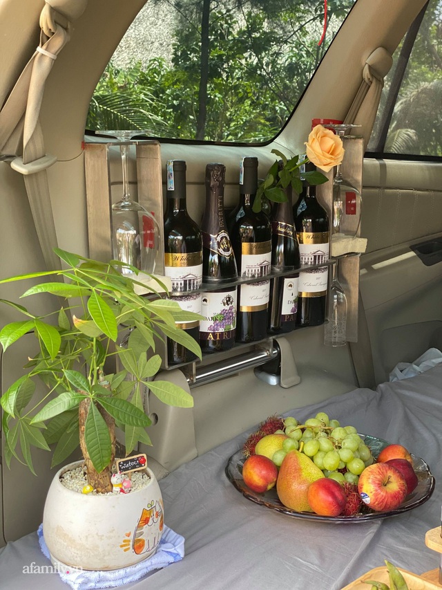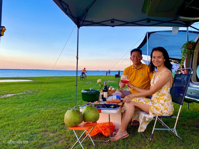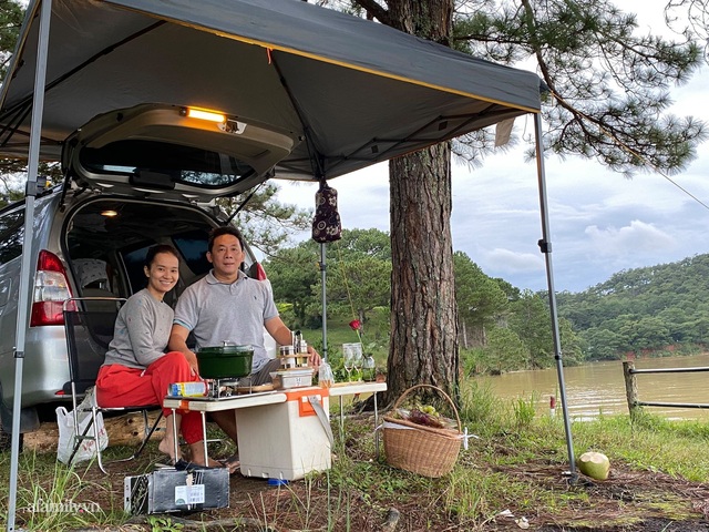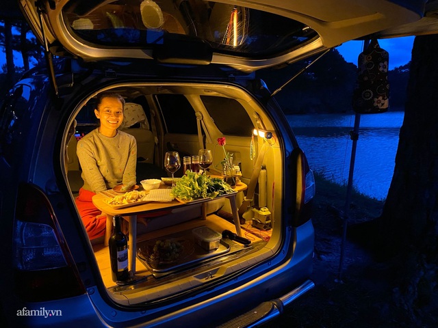 Theo đó, chiếc xe ô tô 8 chỗ đã được gia đình anh Khắc Tường thiết kế thành phòng ốc xịn xò gồm, giường ngủ, giá để rượu, đồ ăn, bồn rửa mặt, nơi tắm và trang trí đèn hoa văn, chỗ để bàn ăn. Trong mỗi chuyến đi, ở những địa điểm khác nhau vợ chồng chị luôn có sự chuẩn bị kỹ lưỡng, thay đổi concept sao cho phù hợp. Đôi khi cả hai mang thêm chiếc ô che nắng, mưa, khăn trải, bếp nướng.