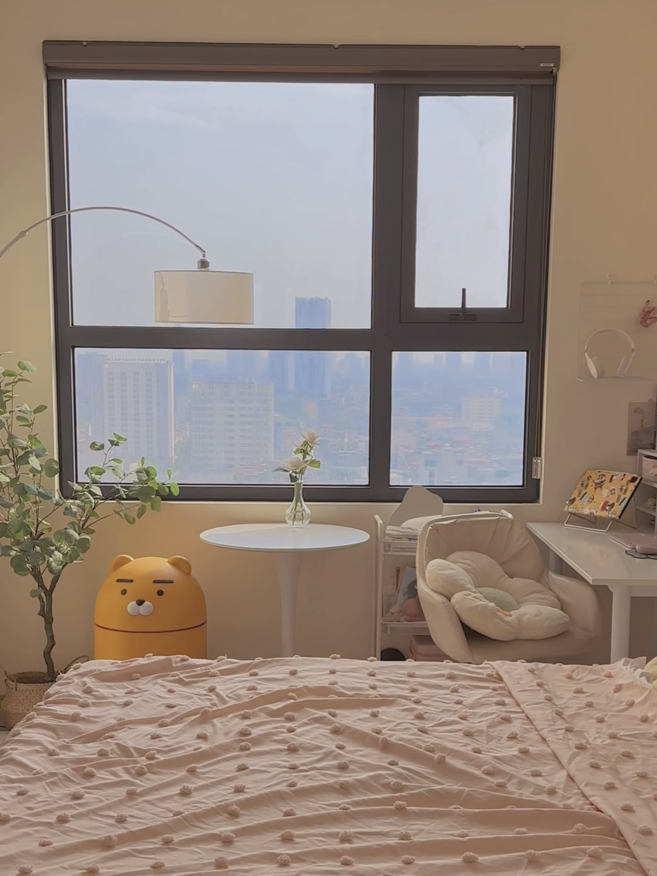 Căn hộ Vân Trang đang ở có nhiều ánh sáng tự nhiên, màu tường là màu kem, giường và tủ màu trắng, không có những vật dụng có hoạ tiết màu mè. Cô bạn đổi màu rèm cửa và trang trí thêm bàn học, bàn tròn, giá sách, bát đĩa, lọ hoa… theo ý thích. Vân Trang chỉ mua những món đồ có giá trị sử dụng lâu dài và có thể phù hợp ở mọi không gian để tiết kiệm tiền và thuận tiện hơn khi chuyển nhà.