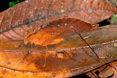 Một con châu chấu lá, còn được biết đến với tên gọi châu chấu rừng, có hình dáng cơ thể như một chiếc lá. Ảnh chụp tại Colombia.