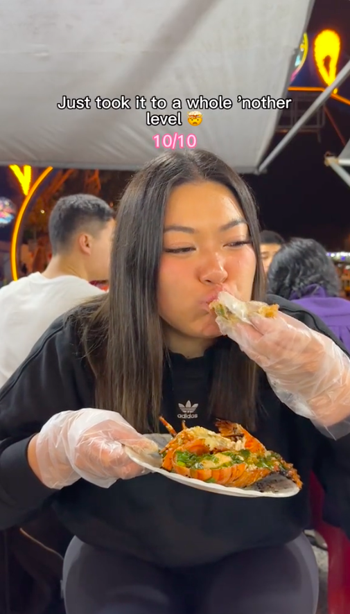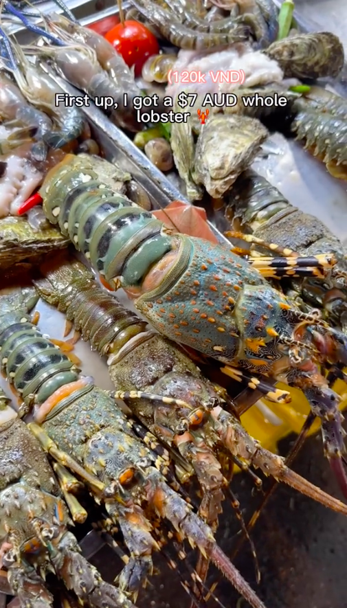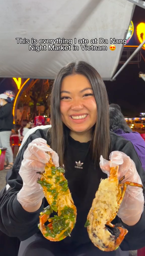 Khi chi 120.000đ để ăn tôm hùm nướng, cô nàng phải cảm thán nói rằng: "Bạn không thể tin nó rẻ như thế nào đâu!" khi người bán còn chia tôm hùm làm hai và chế biến thành hai món khác nhau cho cô. Hoàn toàn không có mỹ từ nào để diễn đạt, nữ du khách chấm hẳn 10/10 cho món hải sản nướng tại xứ biển miền Trung.