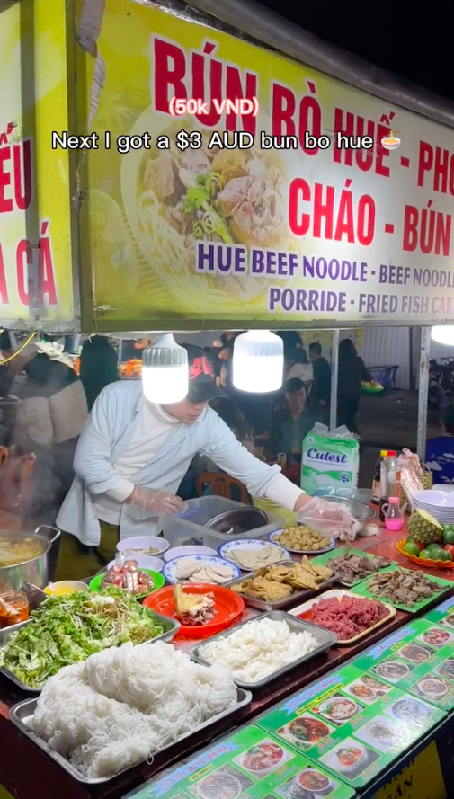 Món chính làm no bụng tiếp theo mà cô thưởng thức là tô bún bò Huế với giá 50.000đ, vì hàng cô chọn ăn tại chợ đêm Đà Nẵng không đầy ắp topping như cô đã từng ăn, nên có chấm 8/10 vì đây cũng là một sự lựa chọn không tồi trong đợt food tour tối này. Có thể thấy TikToker này là "fan ruột" của bún bò Việt nên đã thưởng thức qua không ít phiên bản bún bò tại Việt Nam và có sự so sánh khá kinh nghiệm.