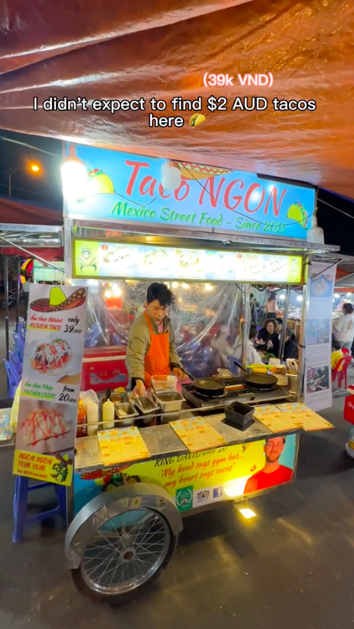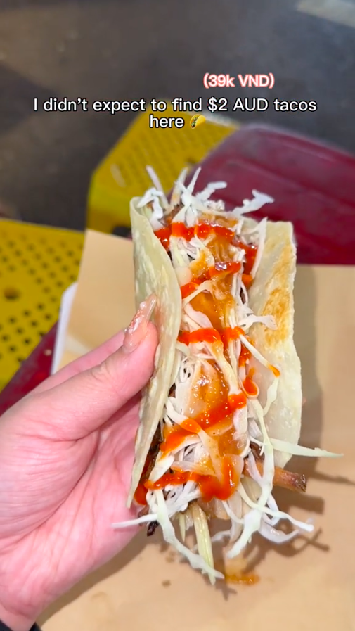 Điều làm cô bất ngờ trong hành trình khám phá ẩm thực chợ đêm là món bánh Tacos của Mexico xuất hiện tại nước Việt. Bánh có giá 39.000đ với phần nhân thịt heo, rau và sốt BBQ, cô cảm thán rằng sự kết hợp phần nhân sáng tạo của người Việt khiến món bánh cực kỳ ngon miệng.