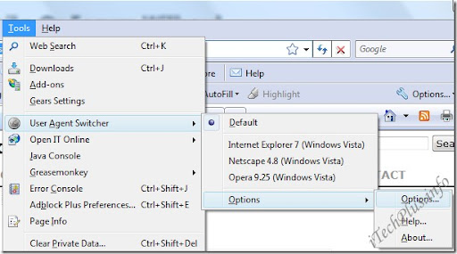 Trước tiên, bạn hãy download về add-on có tên gọi Agent User Switcher (AUS) cho Firefox. Tiện ích này sẽ thêm vào trình duyệt của bạn 1 Menu và một thanh công cụ (Toolbar) cho phép bạn thay đổi qua lại giữa các đối tượng người dùng (User Agent).