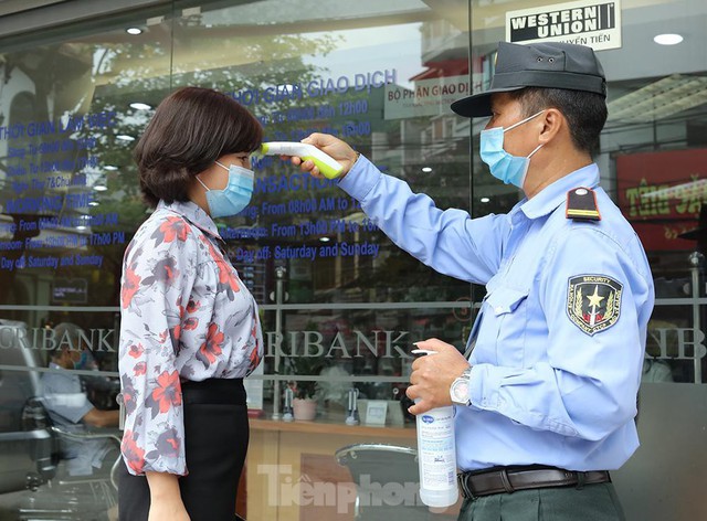 | Trước khi đến giao dịch tại ngân hàng, bất kể khách hàng nào cũng được bảo vệ đo thân nhiệt và dùng gel khử khuẩn |