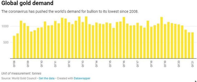 Theo báo cáo của Hội đồng Vàng Thế giới (WGC), nhu cầu vàng trên toàn cầu trong quý 1/2021 là 815,7 tấn, giảm 23% so với quý 1/2020, dù ngang bằng với mức nhu cầu của quý 4/2020. Đây là mức tiêu thụ quý 1 thấp nhất trong vòng gần một thập kỷ.