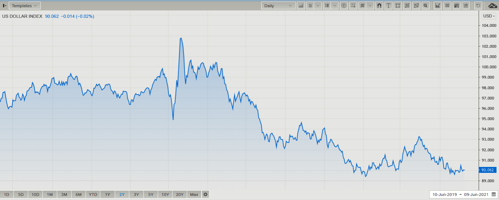 Chỉ số Biến động tiền tệ toàn cầu ngày 9/6 do Deutsche Bank theo dõi đã chạm mức thấp nhất kể từ tháng 2/2020, khi chỉ số dollar index trưa 9/6 ở mức 90,090, so với 90,177 lúc đóng cửa phiên liền trước.
