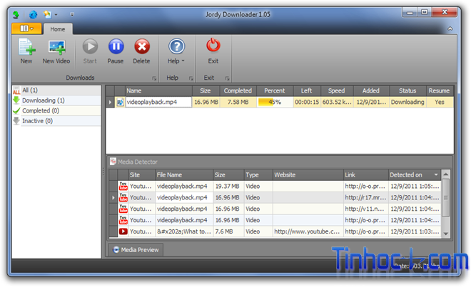 Giao diện này có All, Downloading Completed và Inactive ở phía bên trái, trong khi danh sách Downloading và Media Detector xuất hiện ở phía bên phải. Các nút để thêm Download Video mới, Start, Pause và Delete một mục được tích hợp sẵn ở phía trên cùng của giao diện.