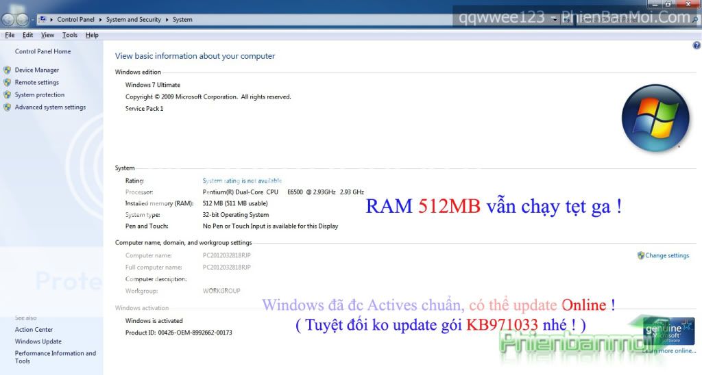 - Có thể Update trực tuyến ( Tuyệt đối ko được update gói KB971033 ) [HR][/HR]