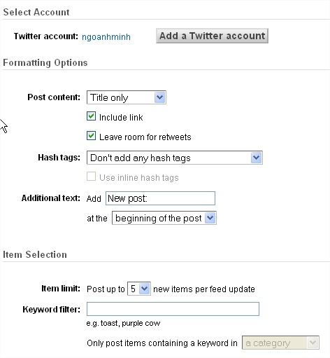 Đây là tính năng mới của Feedburner có tên Socialize.Chức năng chính của Socialize/Feedburner là tự động tweet mỗi khi có bài mới đăng thông qua Feed.
